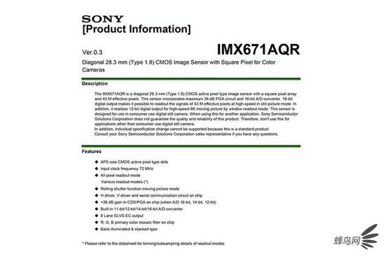 4K分辨率刚刚普及,而各家厂商已经准备角力8K了。在去年夏普带来一款支持8K视频录制的M4/3相机后,传感器大厂索尼也有所动作,近日外媒曝光了索尼一款型号为IMX671AQR的传感器,这款传感器有着4300万的像素,其一大看点在于支持8K视频的录制。