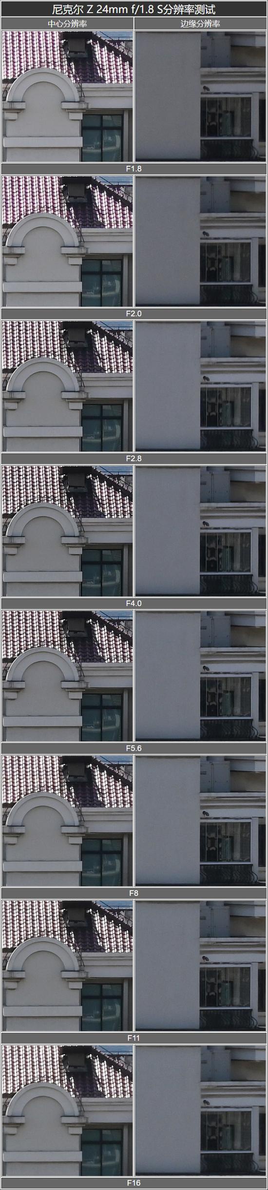 通过对比我们可以看到,尼克尔 Z 24mm f/1.8 S中心分辨率在各档光圈下表现都很好,光圈全开时的表现也是非常出色,画面细节满满,当光圈收到F4时画质表现为最佳。而边缘的分辨率表现同样出色,但相对于中心就有一点点下降,最佳光圈同样在F4。
