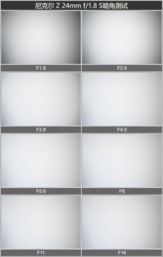 通过实拍测试我们看到,尼克尔 Z 24mm f/1.8 S在光圈全开的情况下有着较明显的暗角,随着光圈的缩小,暗角也逐渐消失。从F4开始就已经没有了明显的暗角存在。