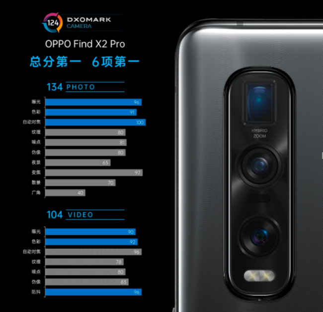 除了屏幕,OPPO Find X2的相机也获得了总分(124)第一以及6项(拍照:曝光、色彩、自动对焦;视频:曝光、色彩、防抖)单项第一。