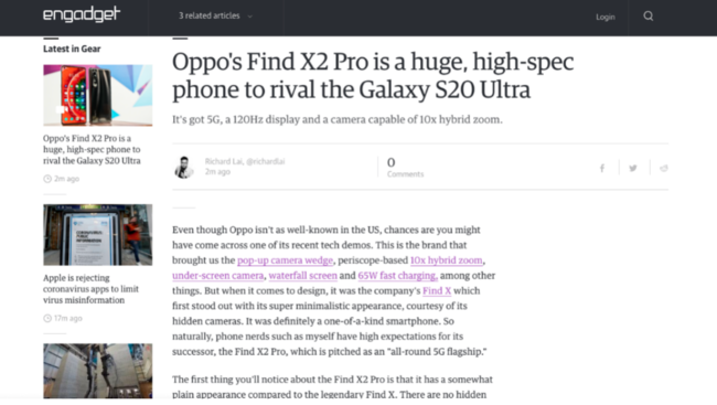 engadget则称:OPPO Find X2 Pro满足我们对5G旗舰手机的所有期望,具有极高规格手机,可与三星Galaxy S20 Ultra相媲美。
