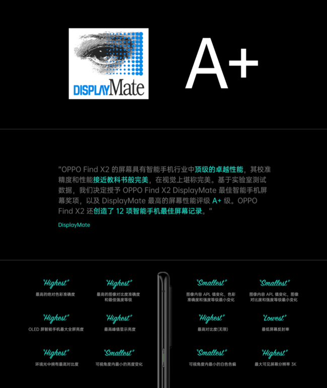 DisplayMate给出的评价是“OPPO Find X2的屏幕具有智能手机行业中顶级的卓越性能,其校准精度和性能接近教科书般完美,在视觉上堪称完美。”