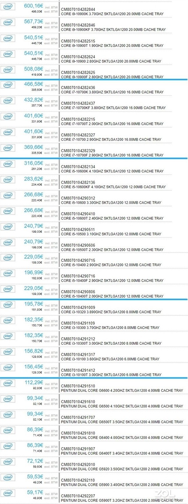 欧洲电商在曝光桌面版十代酷睿的步伐上明显要比别人快得多,之前陆陆续续曝光了22款,甚至连价格都有,当然不清楚是英特尔指导价还是自己瞎编的。如今欧洲电商再发力,一次性把32款桌面版十代酷睿直接摆上了货架,而且也标上了价格。这速度比英特尔快多了。